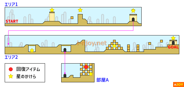 | 星のかけら | エリア1に3個 エリア2に3個 部屋Aに1個 | |