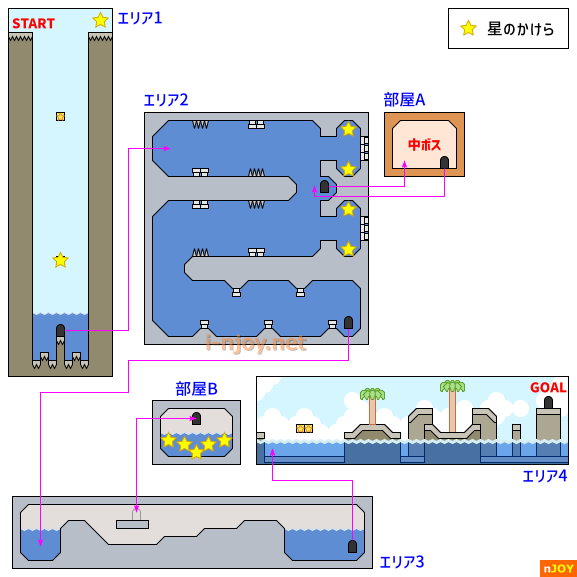 | 星のかけら | エリア1に2個 エリア2に4個 部屋Bに5個 | |